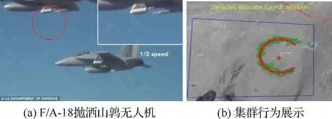 山鹑(Perdix)无人机集群项目由美国战略能力办公室(Strategic Capabilities Office, SCO)主导,采用有人战机投放无人机集群代替空射诱饵等,执行诱导欺骗、前出侦查等任务。2016年10月,完成由3架F/A-18战斗机空中投放103架“山鹑”无人机的演示验证,集群展现了一些高级的行为如集群决策、自适应编队以及集群自愈性,如图12所示[37]。