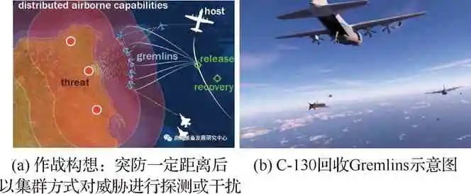 DARPA的“空中航母”构想,如图4所示:所谓“空中航母”就是保障无人机空中运载、操作使用和任务控制的大型航空平台。它能够在飞行中释放出无人机,对无人机的作战运用进行控制,并对完成任务的无人机进行回收、加油、挂弹和维修等保障作业。传统空中作战任务大都采用大型有人机完成,但存在牺牲飞行员生命的风险;采用无人机虽然能够克服这些风险,但飞行高度较低,航程和续航能力也有限。所以用大型有人驾驶飞机携带、发射和回收多个小型无人机联合作战的方案,将能最好地将两者各自的特点相结合:既可以同时延长有人驾驶飞机和无人机的作战航程,又增强了整体的安全性,从而能以有效成本实现突破性的功能,用于执行情报、监视、侦察和作战各种任务。
