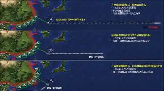 X-47B集群和航母协同想定:美军构想3艘航母组成打击集群(CSG),在绝对安全区域起飞30~40架隐身无人机,代替有人机对重点目标分批次打击,如图3[16]所示。在6 019 km时,12架隐身无人机形成一个中队出动,重点打击沿海区域的防空力量;接着,当CSG行进至距海岸3 241 km时,6架 无人机形成集群前出,降低反介入威胁,增加水面舰艇的安全性;最后,CSG行进至距海岸926 km 时,7架无人作战飞行系统(UCAS)形成集群防空压制,CSG开始密集攻击,此时,水面舰艇和有人驾驶战斗机加人战斗。该集群作战构想为航空母舰提供更强大的防区外攻击能力,并增强海军的前沿部署和持续作战能力。特别需要指出的是,目前虽然X-47B无人机已经转化为空中加油机项目,但是以无人机集群代替有人机进行第1波 次的攻击,仍然是《无人系统路线图》中的主要作战模式之一。