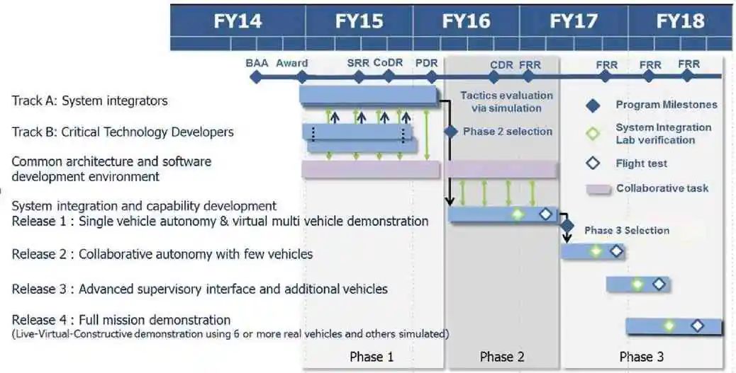 1) CODE:旨在开发基础性的算法和软件,使得现有无人机能够以最小代价,在最小监督下协同工作,使得当前多人操作1架无人机的模式到1人同时操作6架或更多的无人机,以提高美军在拒止或对抗空域中分布式行动能力。项目按照计划分3阶段执行(如图6)[18]。2018年11月,项目演示了装备CODE软件的无人机系统在“反介入区域拒止”环境下适应和响应意外威胁的能力。在真实/虚拟/构造环境下中,6架真实无人机和 24架 虚拟无人机,接收指挥官的任务目标后,自主协同导航、搜索、定位;并在通信和GPS拒止环境中,与模拟综合防空系统保护下的计划和突发的目标作战。CODE的可扩展能力极大增强了现有空中平台的生存性、灵活性和有效性,并减少无人系统的开发时间和成本。
